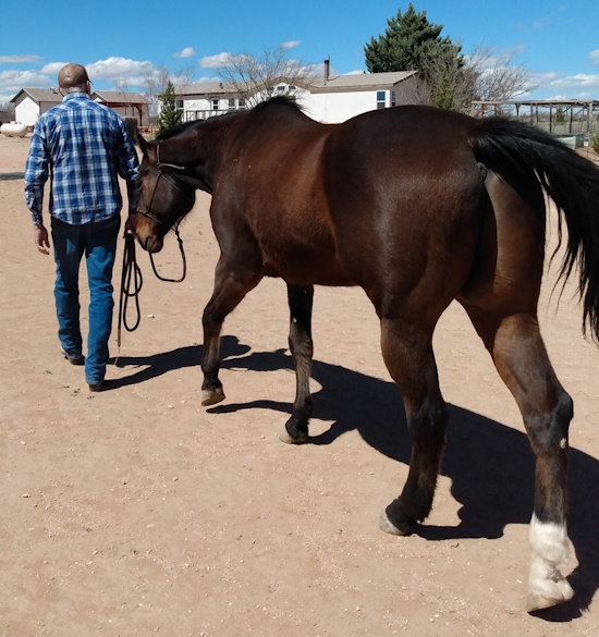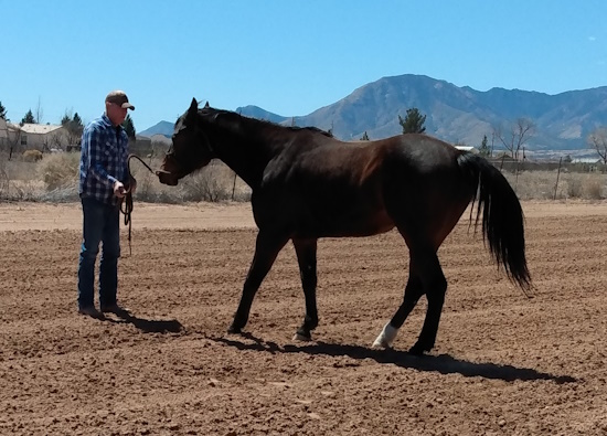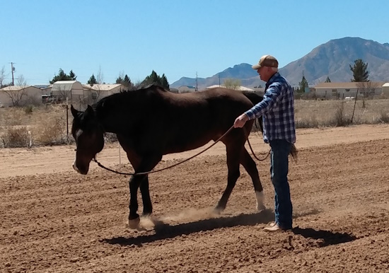 Asking the horse to move around you in a circle is another way to show the horse that you are the leader. As always, this is done is a calm, unhurried manner. The goal is to have the horse follow your direction on a loose rope. You see the drape in the lead rope. That indicates that Lucky is moving in the direction that Marty wants him to go in a relaxed manner.