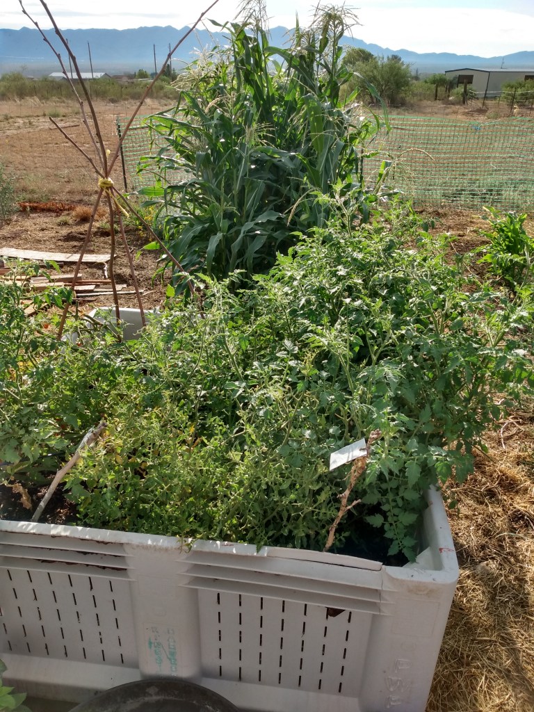 While looking for insects they would root out my seedlings. They had a special thing for my cucumbers and potatoes. They also went after the corn and eggplant as a side light. They completely killed my one and only eggplant. I had a lot of chicken wire so I made cages out of that to protect the seedlings, but the thrashers figured out how to get through. There’s nothing worse than admiring your new plants coming up in the evening only to discover them lying dead and wilted on the ground the next morning. I think I replanted the cucumbers and corn three times before I figured out that the only cage that would deter the thrashers was ¼” wire made into a cylinder. Anything growing in the ground was vulnerable. Everything in the bins did great. The thrashers didn’t go for seedlings in the bins for some odd reason.