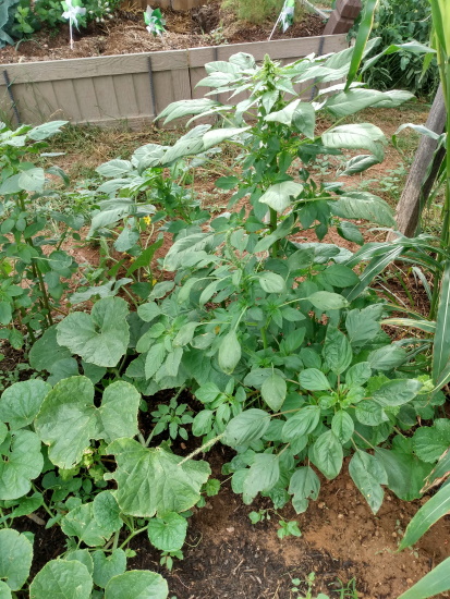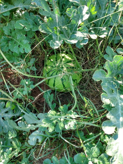 Chimayo melons grew well but were tasteless. They’re the plants with the big leaves. The little leaves are wild amaranth also known as spiny pigweed.
