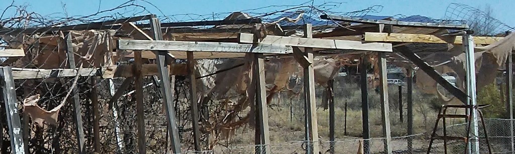 Like I said, the grape arbor was a bramble pile gone wild. The ramshackley 2 x 4 structure was built for the grapes to vine on and to support shade cloth. The shade cloth had deteriorated to the point it looked like the dead pirate’s ship from “Pirates of the Caribbean”. Plus, there was wire peeling up everywhere.