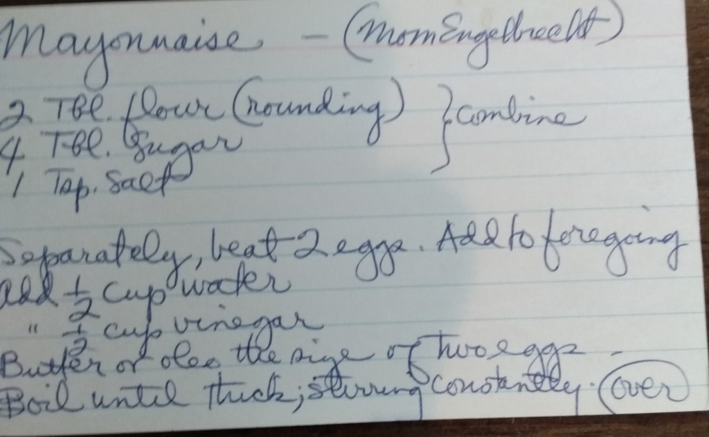 I am going to make this. My aunt said that my grandmother would be preparing dinner and she would instruct one of her daughters to go into the kitchen and make this mayonnaise when it was almost dinnertime.