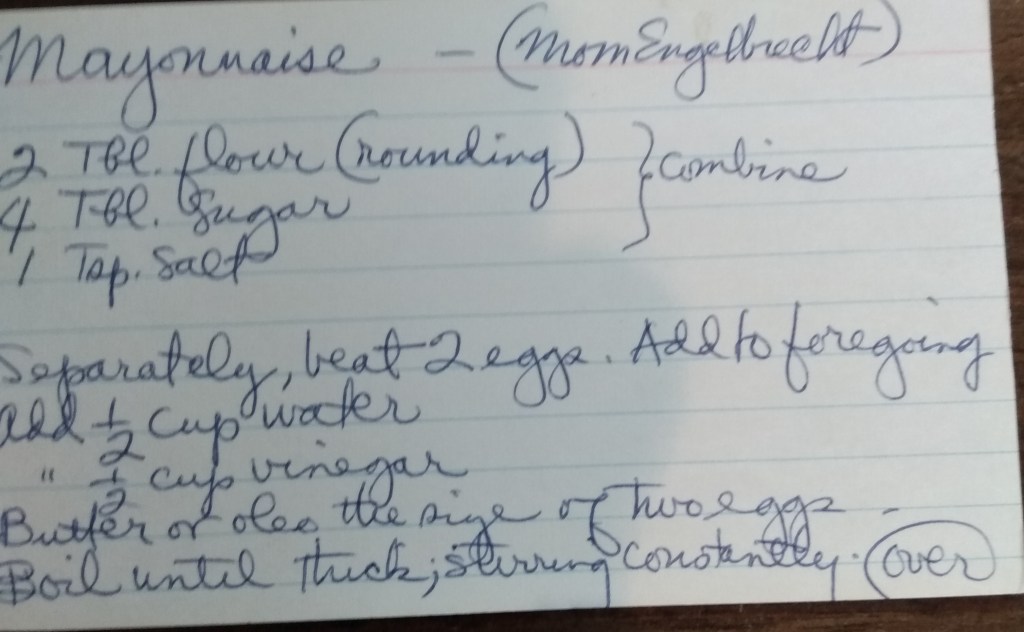 If you are an experienced cook you will see right away that this is not your classic mayonnaise recipe. The only thing it has in common with that are the eggs. Otherwise it might be more appropriately called “sandwich spread” or mock mayonnaise and it doesn’t taste like the mayonnaise we are used to but it has a sweet tangy flavor all its own. It’s very good if you simply forget the name and enjoy it for its unique quality.